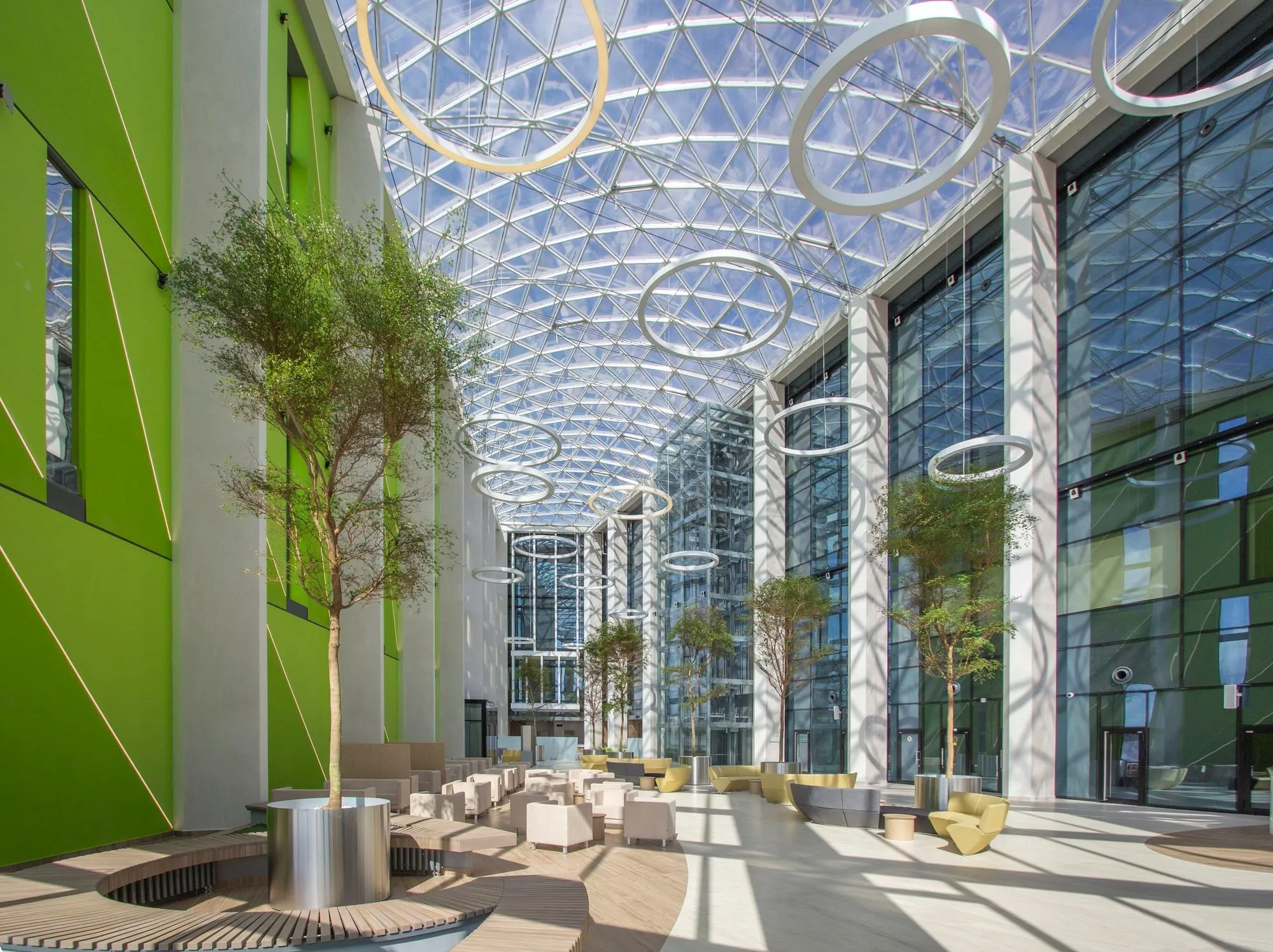 Следующий интересный объект появился совсем недавно в Сколково – это Международный медицинский кластер, основными принципами которого являются экологичность и комфорт. Попадая в здание, понимаешь, что в нём всё продумано до мелочей: для пациентов созданы все условия, чтобы приятно отдохнуть и расслабиться, забыв о факте лечения. Каждое пространство имеет определённую тематику – различные регионы, к которым специально подобраны растения. Материалы также использованы долговечные и гипоаллергенные. Для некоторых зон даже разработали специальный арома- и звуковой дизайн, которые способствуют максимальной релаксации и спокойствию, способствующих исцелению.