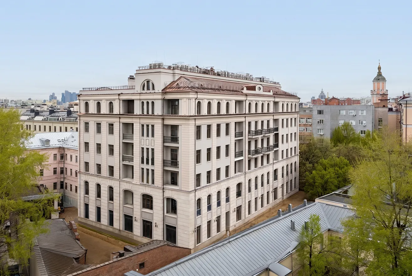 Чтобы сохранить исторический объём и фасады дома, Sminex применил технологию «металлической рубашки». Все 4 стены поместил в специальный каркас, перераспределив нагрузку на время создания нового перекрытия и вычинки кирпича. На это ушло порядка 400 тонн металла. Девелопер расчистил старые штукатурные слои, после чего выполнил ручную вычинку и восстановил кирпичную кладку стен, усилив их методом инъектирования. Два нижних этажа облицевал золотисто-кремовым гранитом из Индии. Тщательно отобрал образцы камня, чтобы сохранить целостность деликатного природного рисунка. Вернул первозданный вид декоративным элементам: карнизам и пилястрам.
