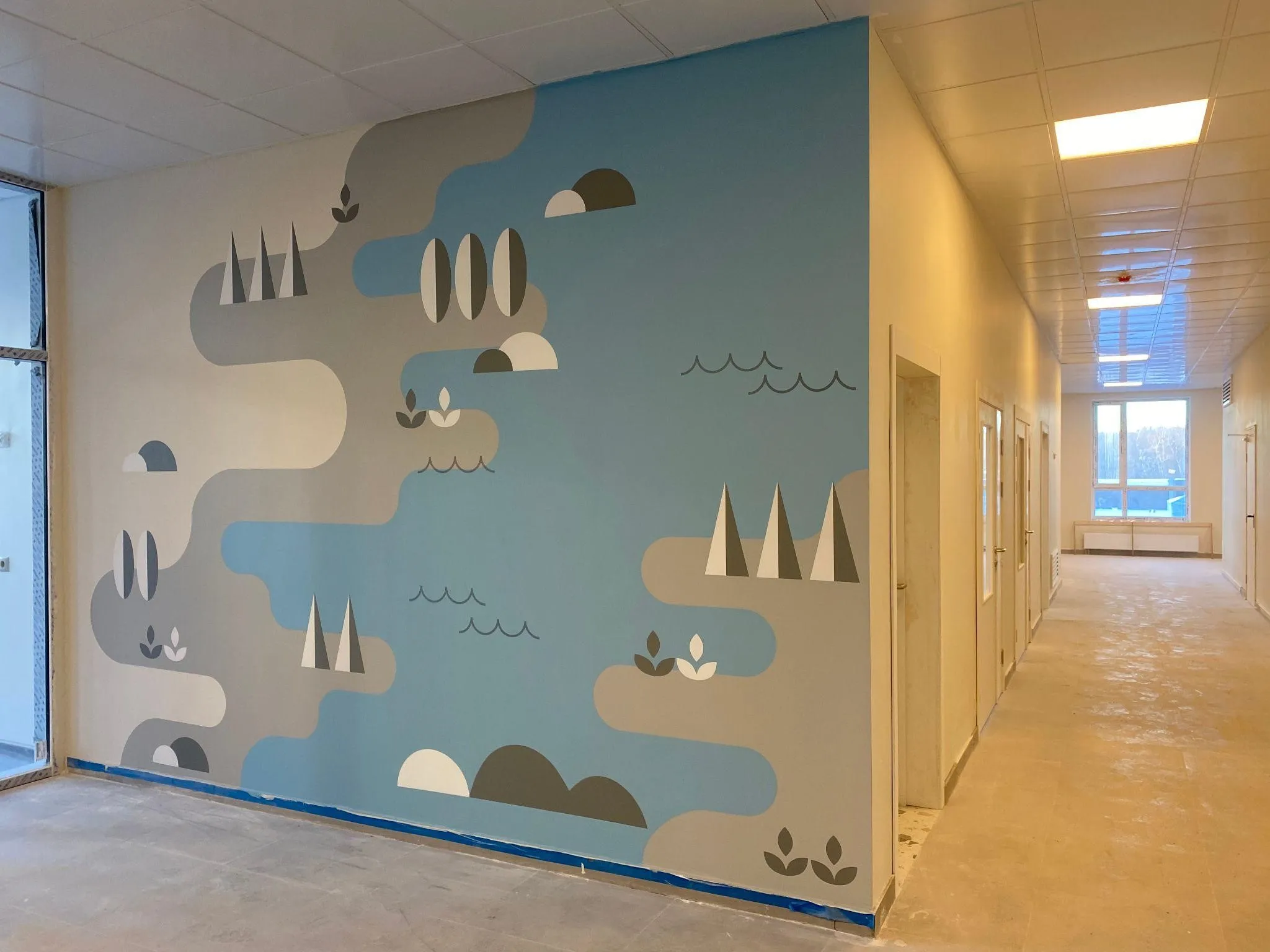 Визуализация разработана архитектурным бюро Heads Group в концепции интерьеров образовательного учреждения. На территории детского сада суммарно будет около 1 100 квадратных метров различных рисунков.