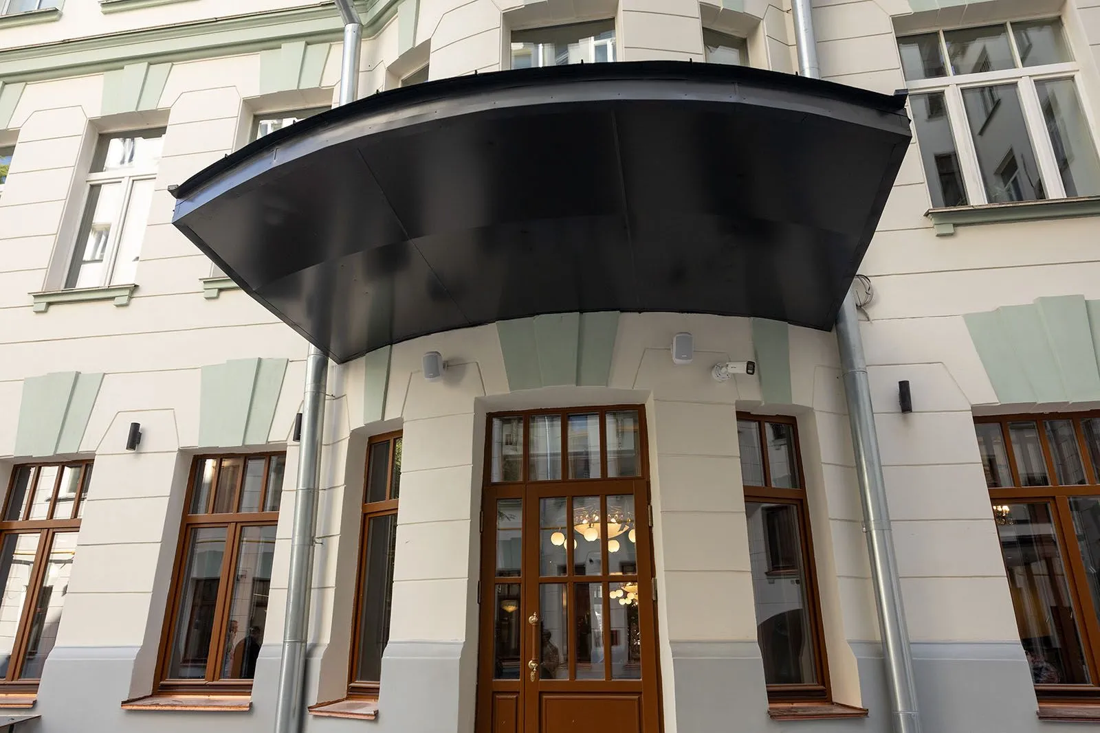 Работы вели в соответствии с проектом, который предусматривал максимальное возвращение помещений к историческому облику. В результате на потолке появилась тонкая узорчатая сеть прекрасного лепного декора, подсвеченного неяркими огнями красивой латунной люстры. «Вернули» в помещение и аутентичный цвет стен фойе, они стали светло-голубыми. Оригинальный цвет появился в результате очистки стен от целого десятка старых слоев разных цветов и оттенков. Вестибюль теперь украшен по-новому, на лестницах появились гранитные перила.
