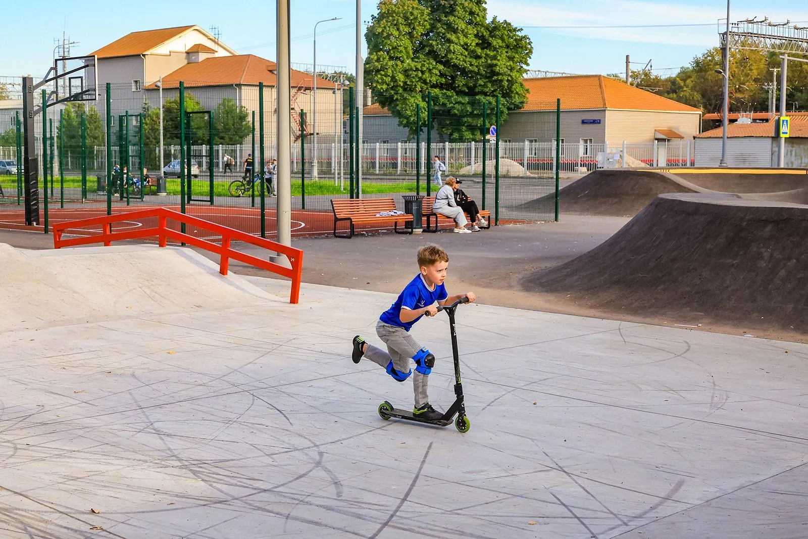 На месте бывших гаражей обустроили спортивный кластер со скейт-парком, памп-треком, площадками для стритбола и волейбола. На территории высадили 18 тысяч квадратных метров газона, а до конца осени добавят более 60 деревьев.