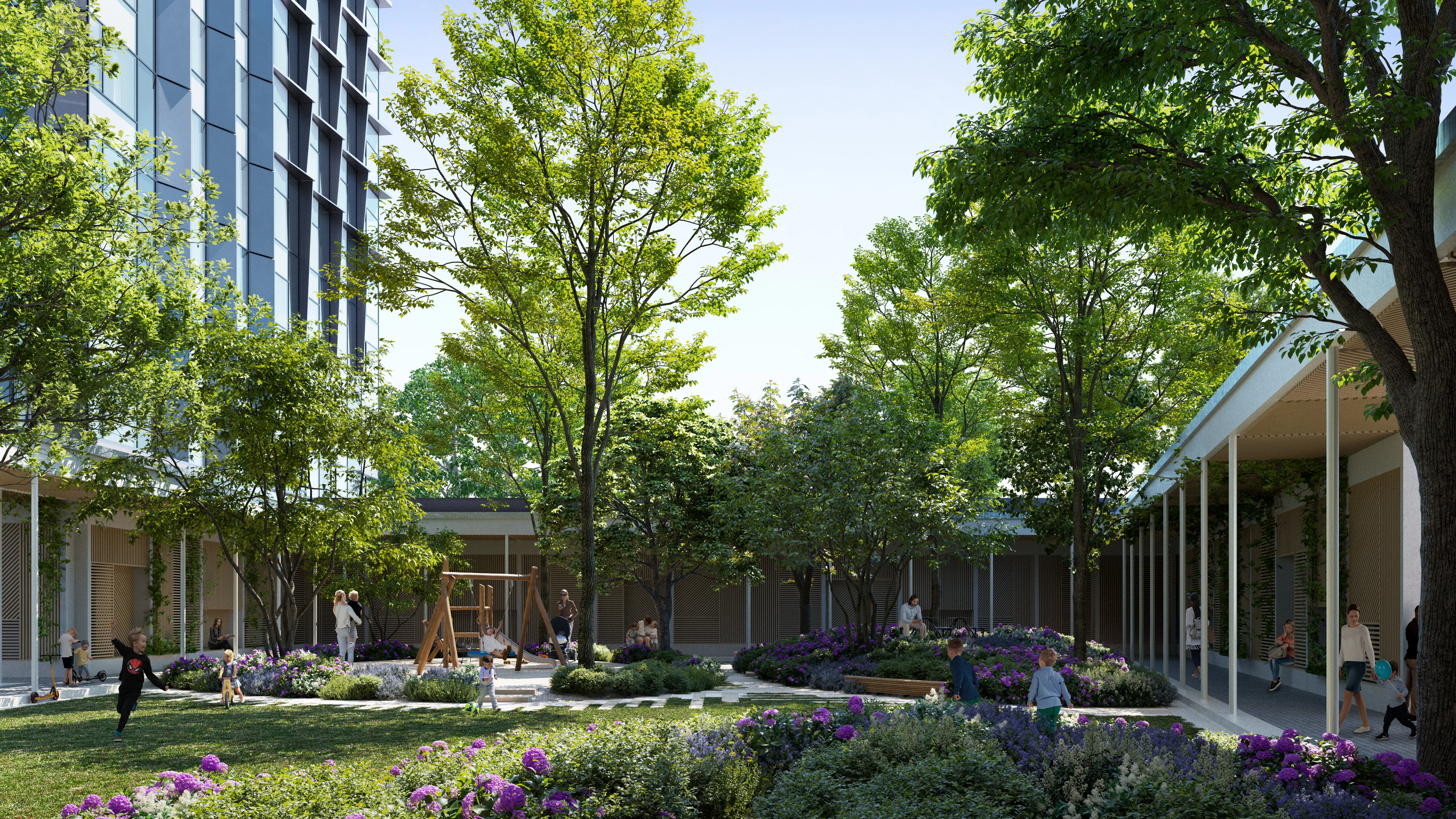 Помимо этого, на территории будут благоустроено четыре зеленых тематических зоны, в одной из которых предусмотрено патио с сухим фонтаном. В три других зеленых зоны включат детские игровые пространства и площадку для занятий спортом со столом для настольного тенниса. Любители бега смогут прямо с территории квартала проложить свой маршрут по эко-треку, который объединит Moments с парком «Покровское-Стрешнево». Общая площадь благоустройства на территории квартала составит порядка 1,5 га.