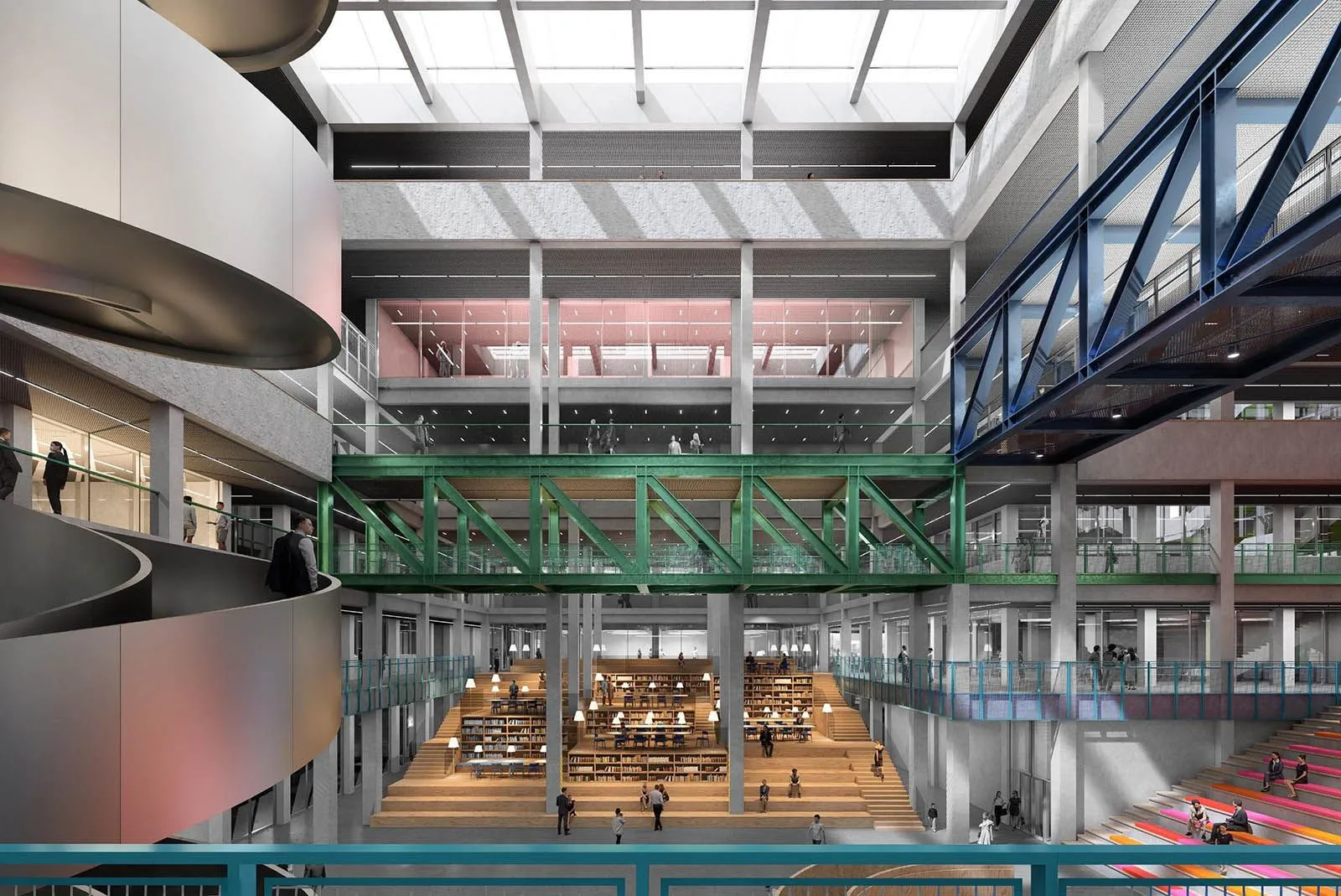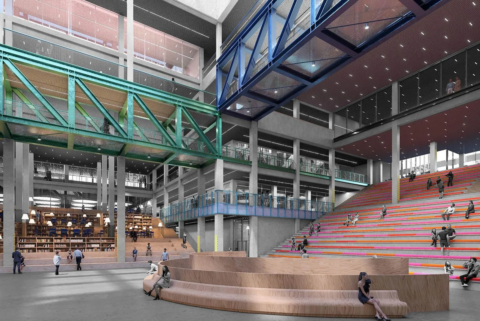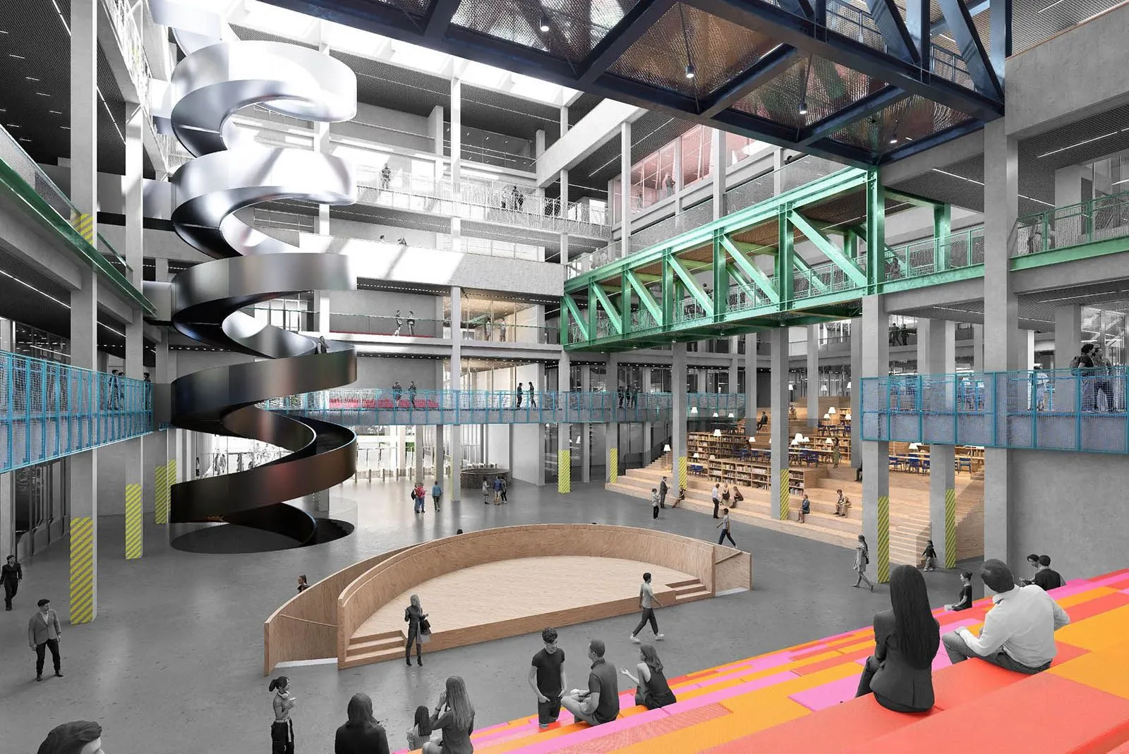 Внутри оборудуют лаборатории, мастерские, два спортивных зала и амфитеатры. Один из них будет выполнять функции медиатеки, второй – площадки для мероприятий и отдыха.